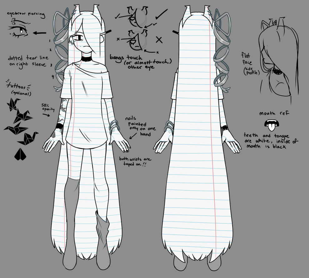 - her eyebrow piercing is a staple- she has a dotted tear line on her right sleeve- her tattoos are optional, but are black at 58% opacity- both of her wrists are taped on- her bangs tend to touch her other eye -- forehead is rarely exposed- only her left hand has its nails painted- her teeth and tongue are both white- from the side her face is mostly flatOTHER NOTES